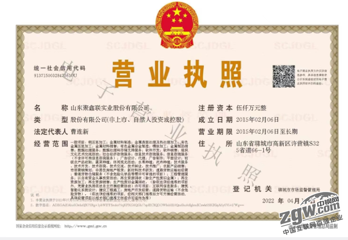 | 公司名称 | 山东聚鑫联实业股份有限公司 | 注册地址 | 山东省聊城市高新区许营镇S325省道66-1号 |